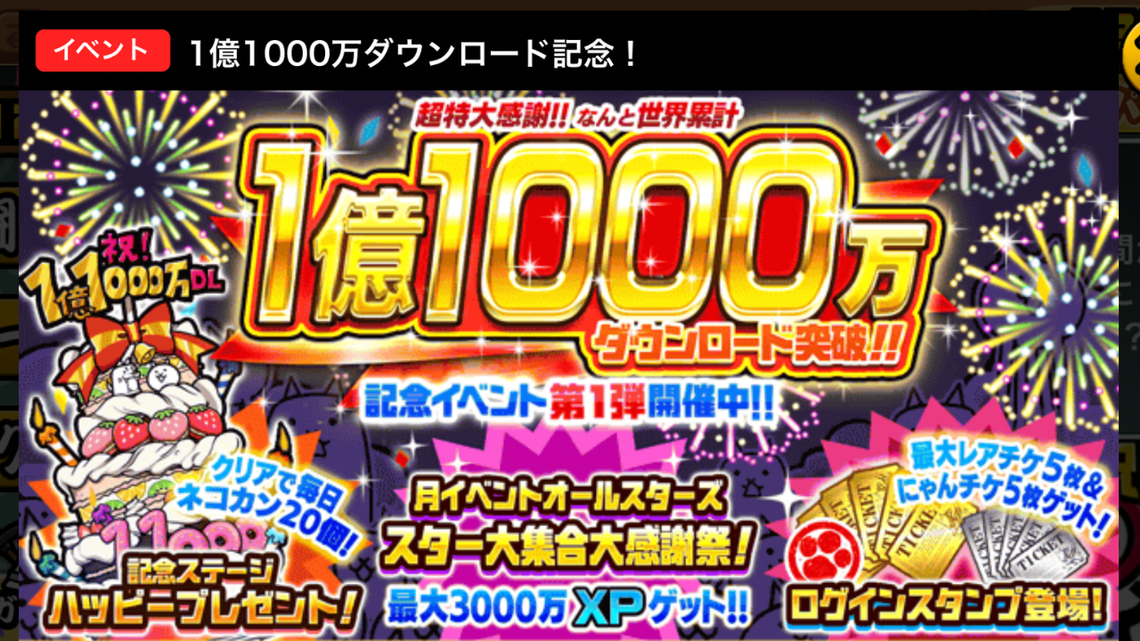 『にゃんこ大戦争1億1000万ダウンロード記念』イベントで『イベント限定キャラ』を手に入れて、さらに強化していきましょう。