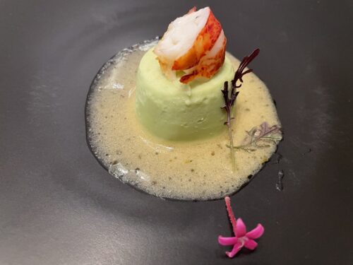 白身魚とグリンピースのムースに、オマール海老を乗せたものですが、もうこれはアートですね。