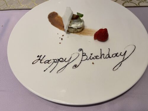 大きな皿の中央に『Happy Birthday』の文字が描かれていました。