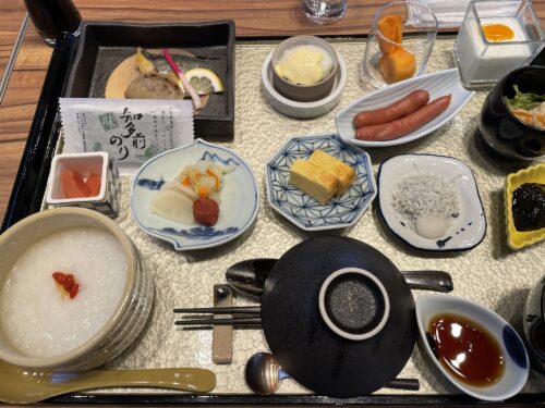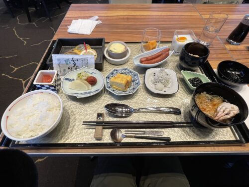いつも、チェックインの際に翌日の朝食は『和食』か『洋食』か聞かれるのですが、今回は『朝食は和洋折衷になりました。』と告げられました。